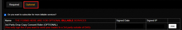 2. In the portal, click on the Optional tab and then look for “THIRD PARTY DROP COPY CONSENT RIDER (Optional)” and click sign.